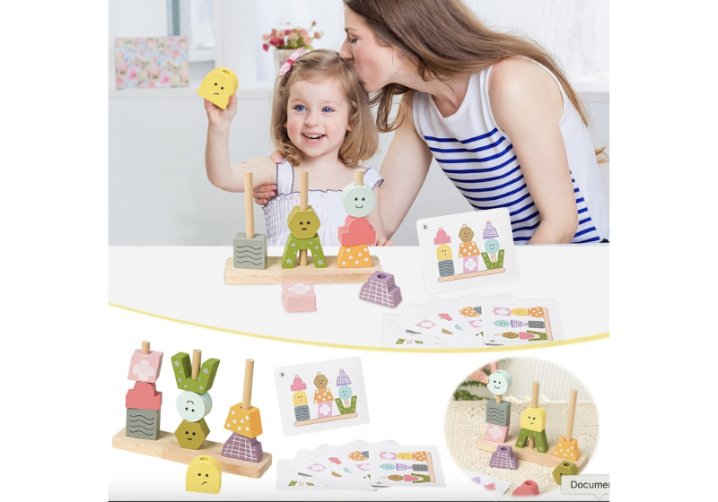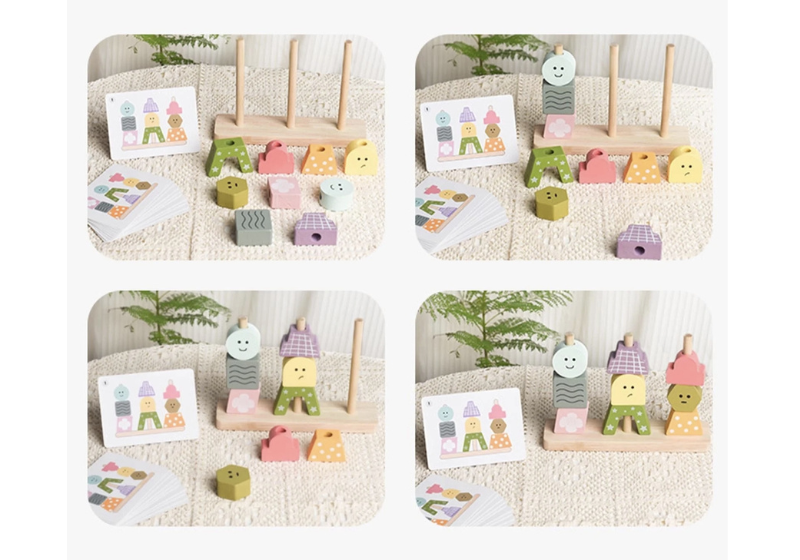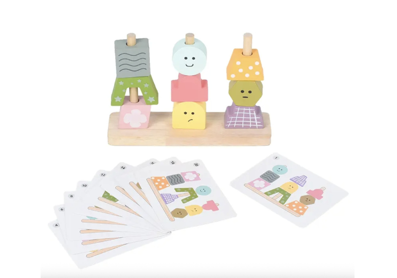 Este juego es una excelente herramienta para que los niños desarrollen habilidades mientras juegan. Incluye 9 bloques de madera de diferentes formas y diseños y 10 tarjetas de doble cara con desafíos.