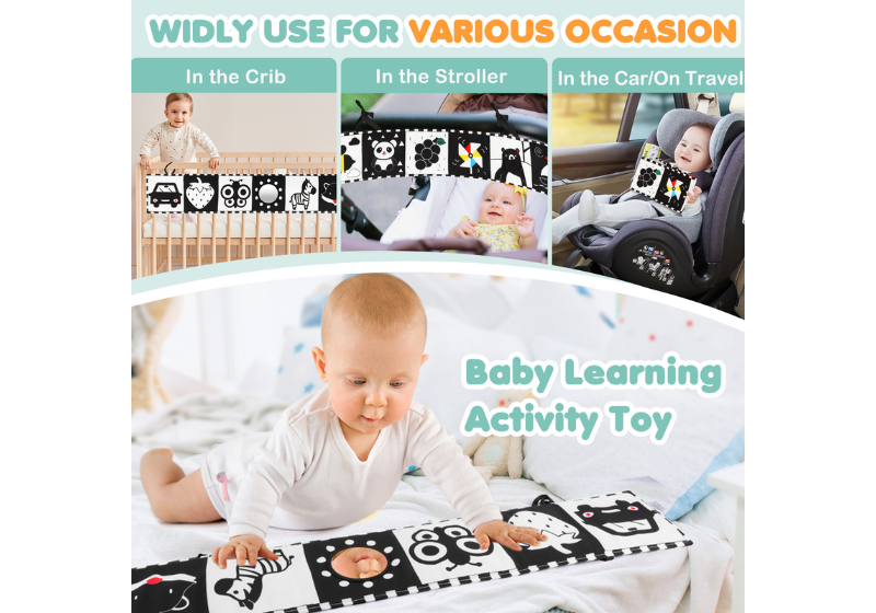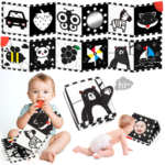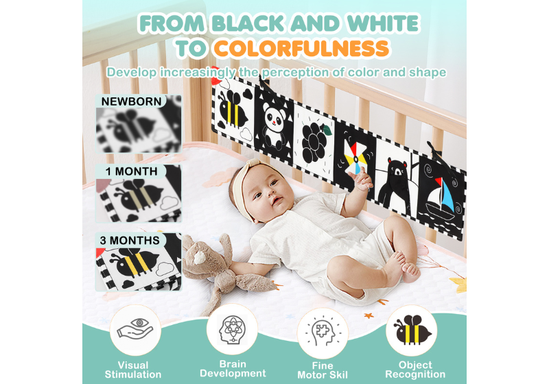 Durante los primeros meses, los bebés solo pueden ver objetos a una distancia de hasta 20 cm y aún no logran enfocar con claridad. Por eso, los materiales en blanco y negro son ideales para estimular su desarrollo visual desde el nacimiento.