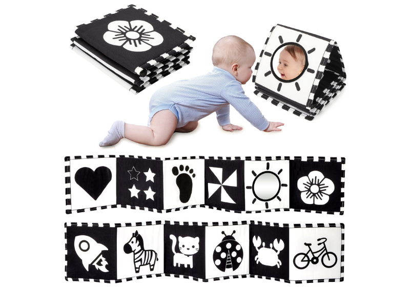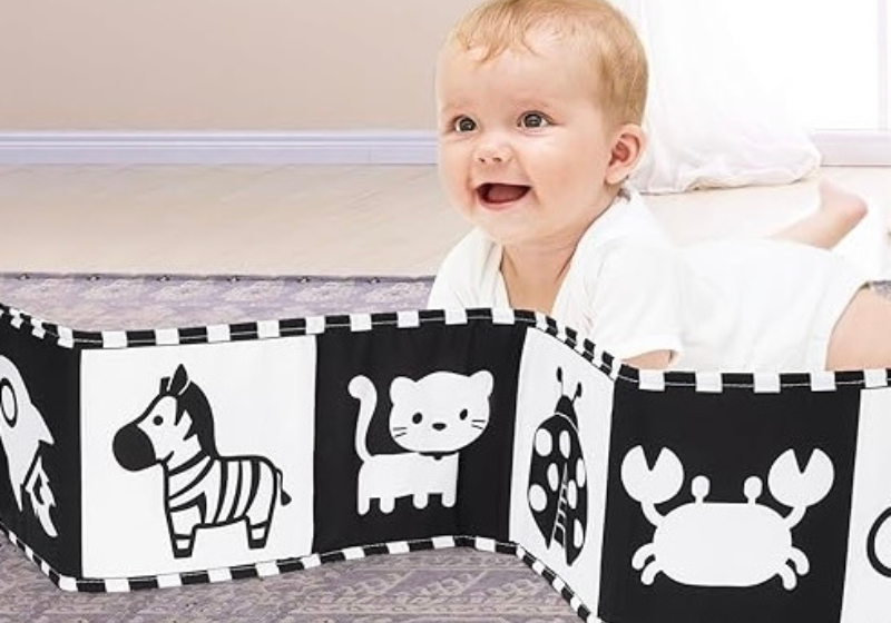 Durante los primeros meses, los bebés solo pueden ver objetos a una distancia de hasta 20 cm y aún no logran enfocar con claridad. Por eso, los materiales en blanco y negro son ideales para estimular su desarrollo visual desde el nacimiento.