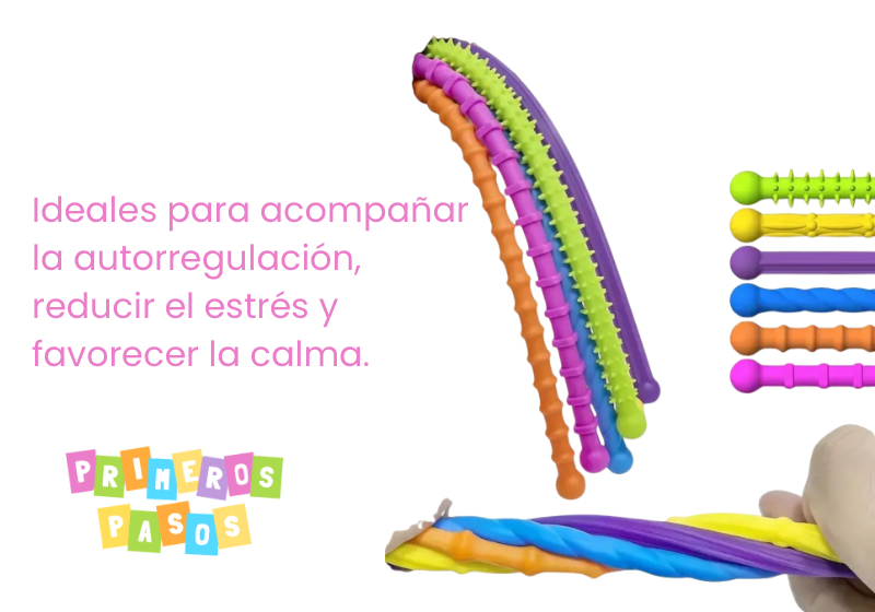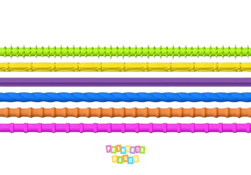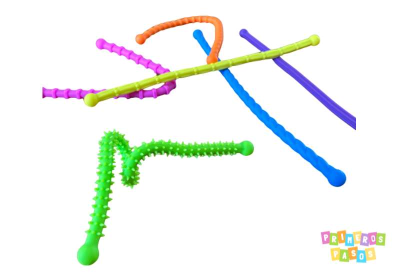 Set de 6 palos sensoriales que estimulan la exploración y la habilidad manual. Además por su textura y flexibilidad invitan a estirarlo, doblarlo y torcerlo, ofreciendo una experiencia táctil relajante y estimulante.