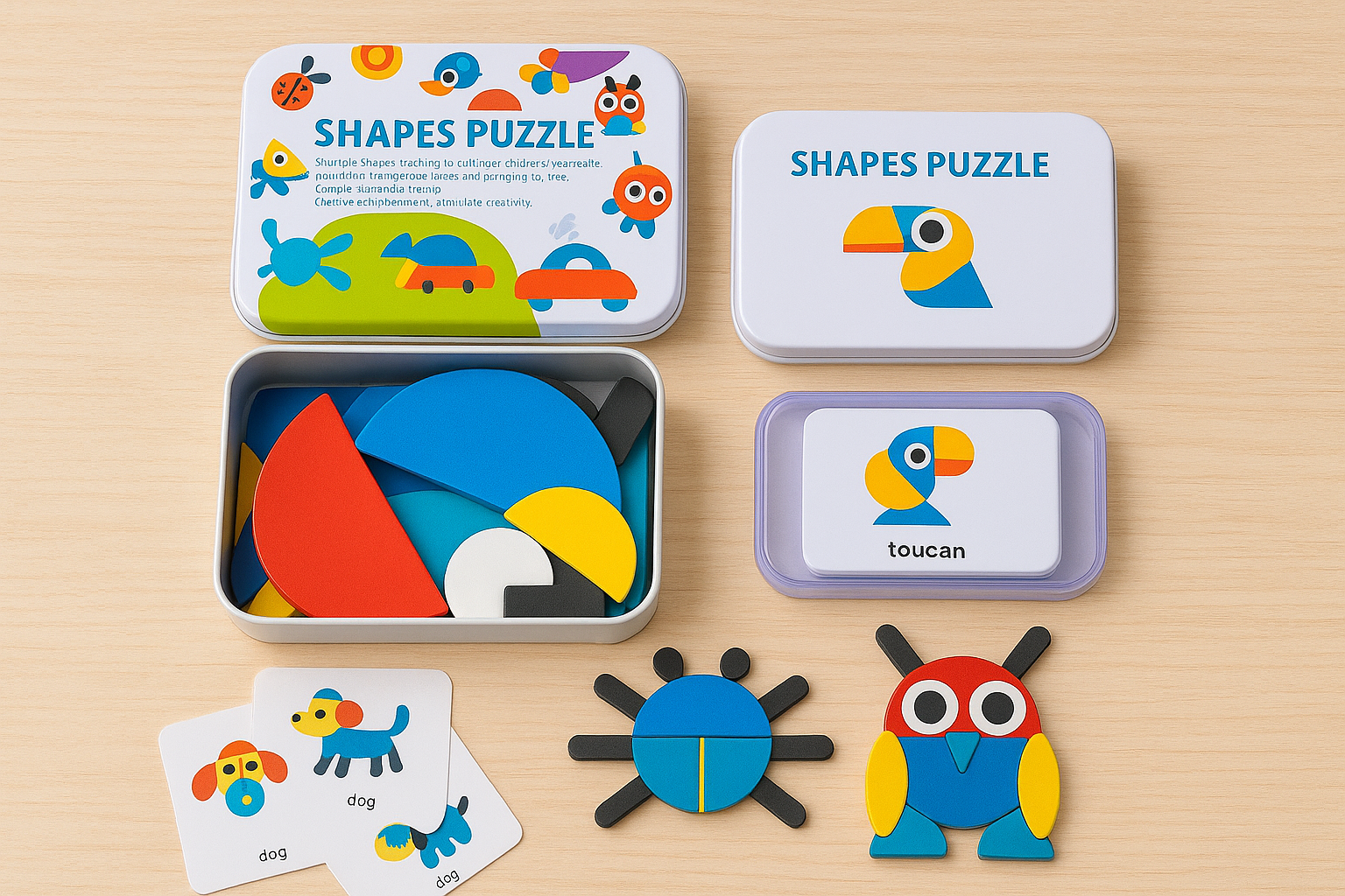 Incluye piezas geométricas de colores que permiten formar múltiples figuras, siguiendo las tarjetas de modelo o creando diseños propios.